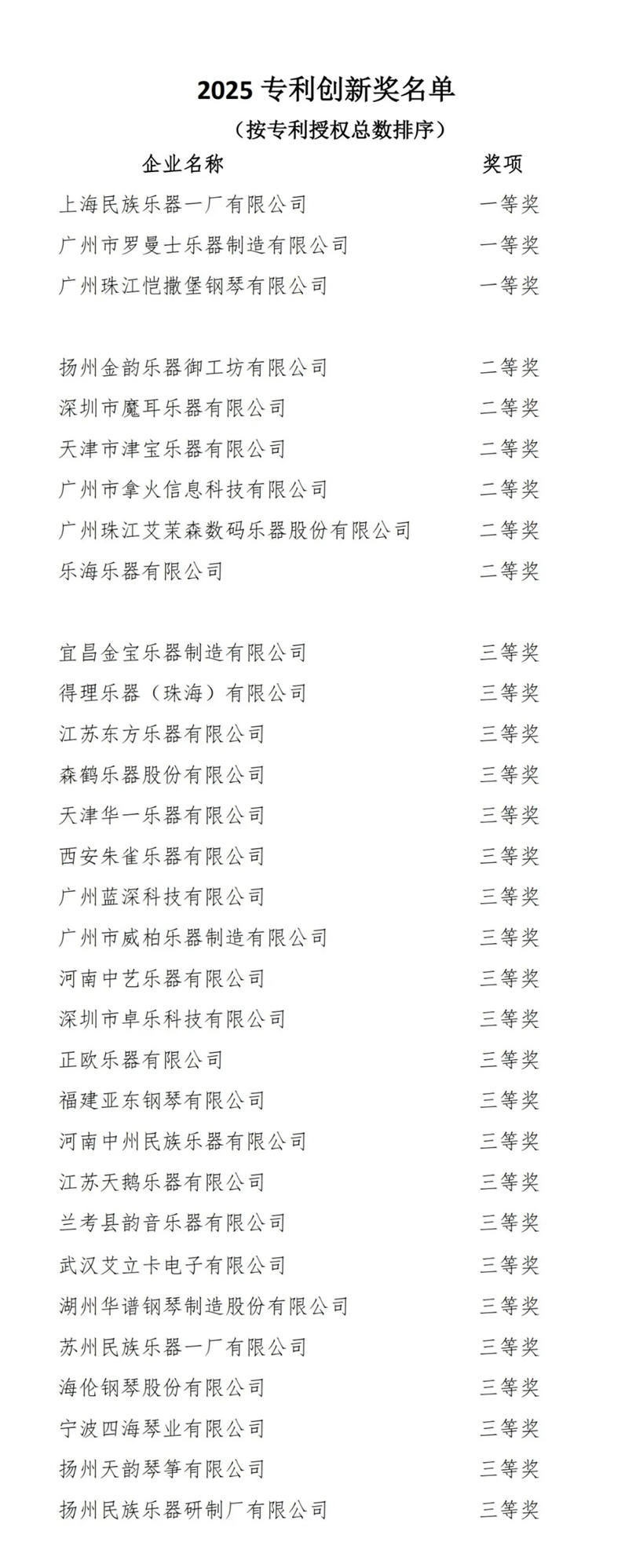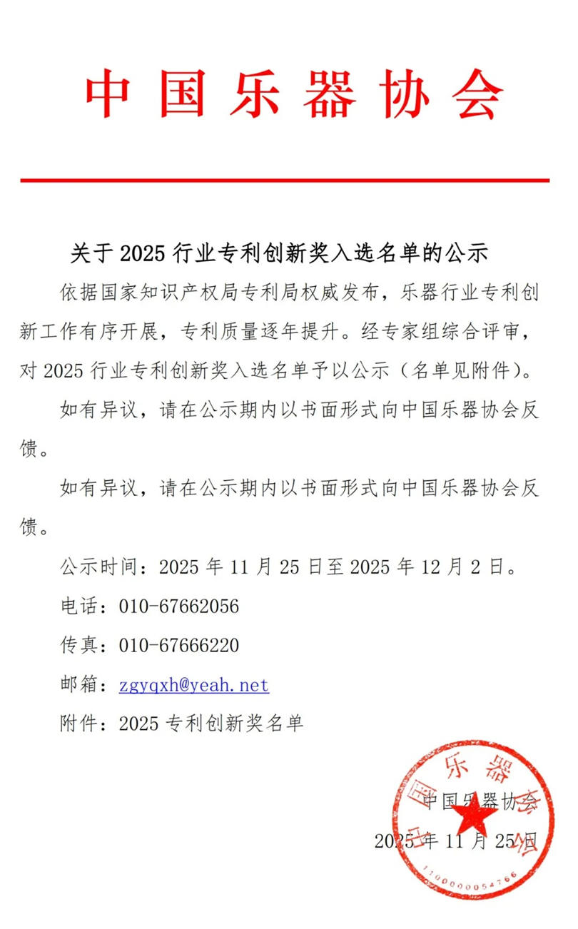 关于2025行业专利创新奖入选名单的公示-中国乐器协会