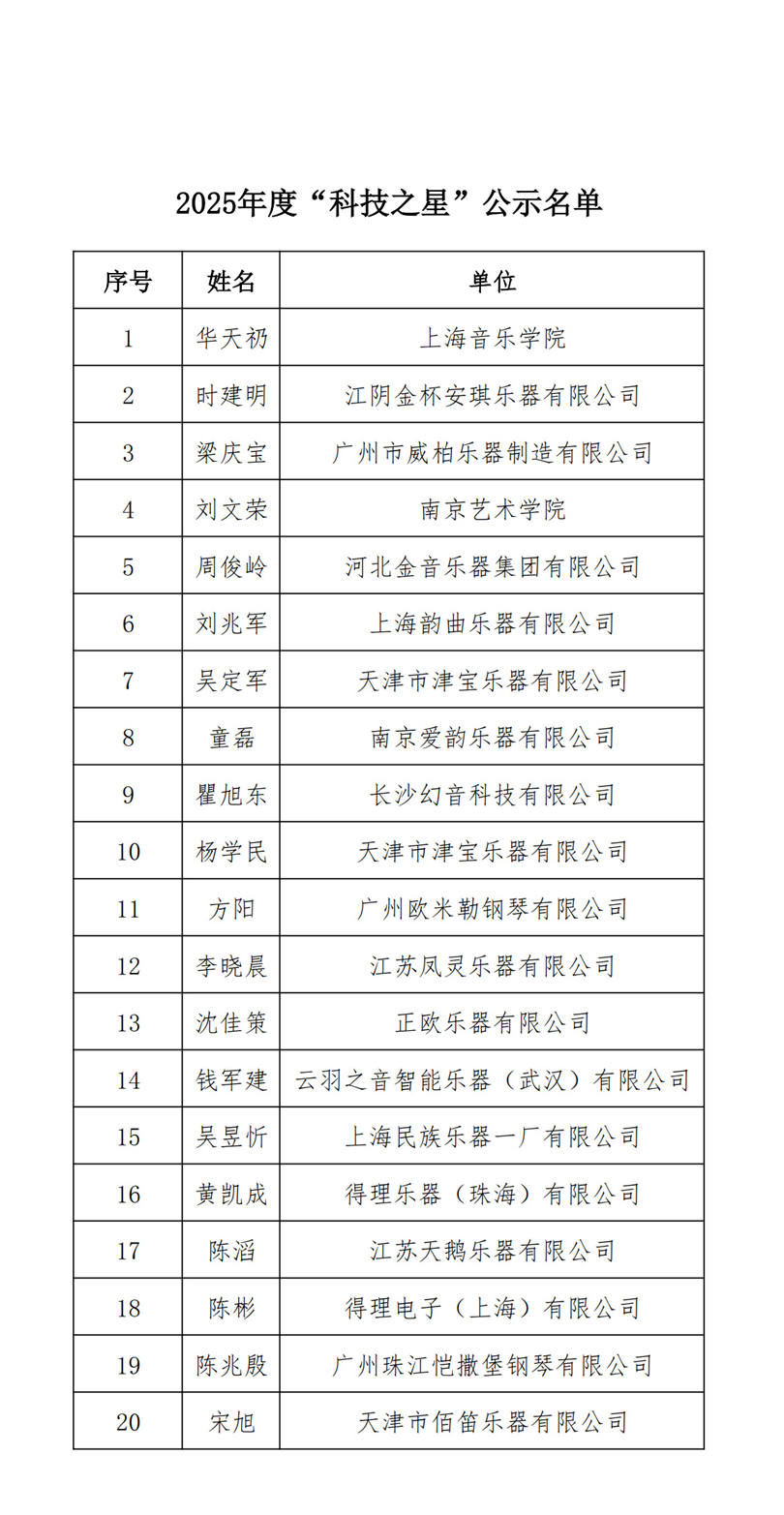 关于2025年度乐器行业“科技之星”入选名单的公示-中国乐器协会