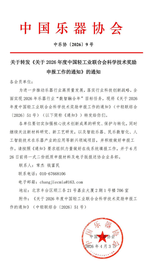 关于转发《关于2026年度中国轻工业联合会科学技术奖励申报工作的通知》的通知-中国乐器协会