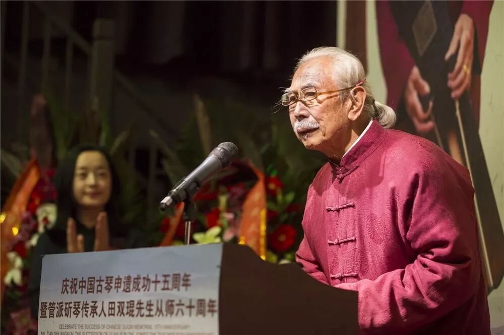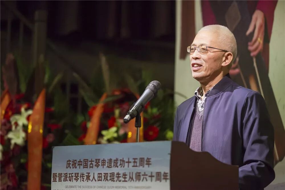 著名斫琴家、管派斫琴传承人田双琨致辞,首先对古琴成功入选非物质文化遗产名录15周年表示祝贺,并对即席领导、特邀嘉宾、行业同仁、媒体朋友以及门徒的莅临表示衷心谢意。“感恩得遇恩师管平湖,成为其关门弟子,并在恩师悉心教导下,逐步掌握斫琴技艺;感恩近60年来,得遇热爱斫琴艺术同仁与门徒们;感恩自己总在对的时间,遇到对的人,众琴家汇聚合力共谋斫琴事业的宏图。”田双琨先生用朴素的话语回顾六十载斫琴生涯,并表示将继续弘扬管派斫琴艺术风格,以自身绵薄之力助力古琴艺术的传承与发展。