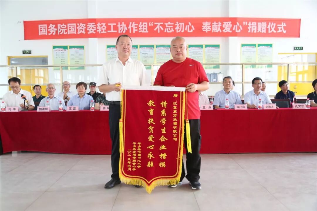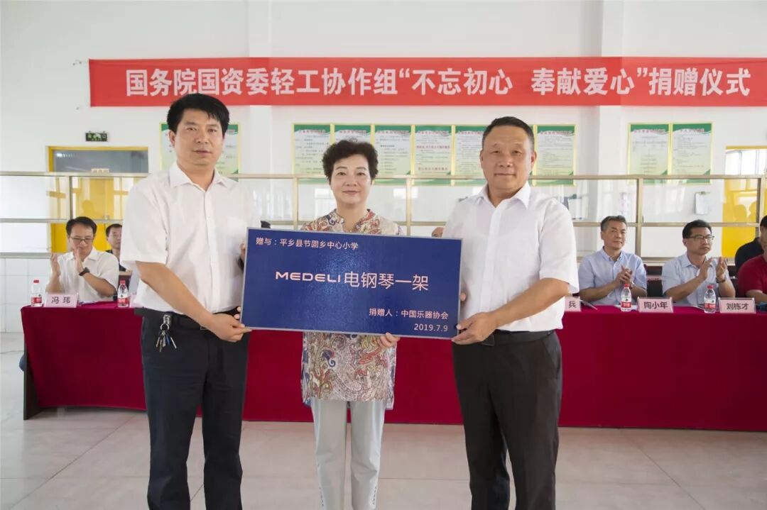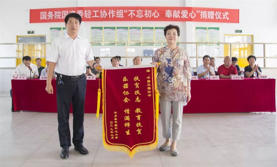 为落实脱贫攻坚战略,贯彻落实习近平总书记扶贫先扶志、扶贫必扶智重要精神的重要举措,7月9日,国务院国资委轻工协作组“不忘初心 奉献爱心”捐赠仪式在河北省邢台市平乡县节固乡中心小学隆重举行。中国轻工业联合会党委副书记、中国乐器协会理事长王世成,中国轻工业联合会纪委书记陶小年,国资委轻工机关服务中心主任、党委副书记王兵,国资委离退休干部局党委书记侯孝国,国资委离退休干部局党委副书记、纪委书记巴清宏,中国家用电器协会理事长姜风,江苏东方乐器有限公司董事长孔文忠,中国大众音乐协会口琴专业委员会会长白燕升,平乡县节固乡领导以及多位协作组专家,与节固乡中心小学学生共计200余人出席捐赠仪式。