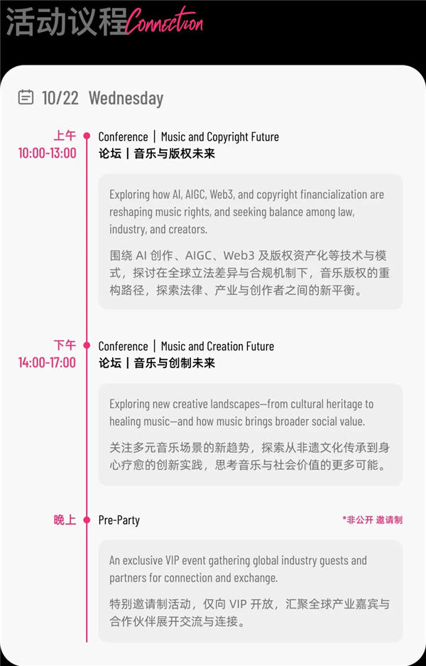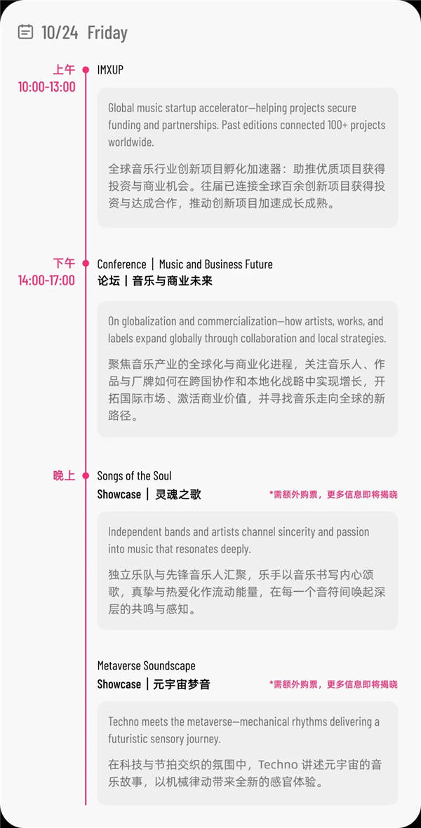 10 月 22 日至 25 日,Music China 携手 IMX 在上海新国际博览中心 N3 馆,将呈现产业论坛、IMXUP、未来展区、商业触点、全球发布及 Showcase6 大活动板块,汇聚来自全球不同国家地区、不同领域的过百位行业先锋,展开近 20 场深度论坛,推动音乐产业的全球协同进化。