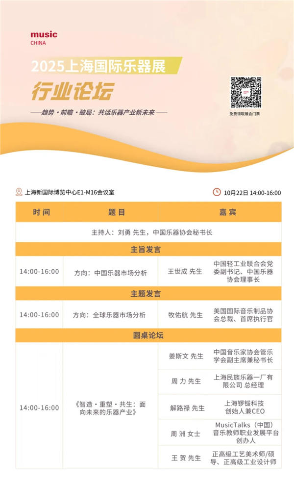 在圆桌对话环节,中国音乐家协会管乐学会副主席姜斯文、上海民族乐器一厂有限公司总经理周力、上海锣钹科技创始人解路禄、MusicTalks(中国)音乐教师职业发展平台创办人周洲及正高级工艺美术师/硕导、正高级工业设计师王贺,将围绕主题《智造·重塑·共生:面向未来的乐器产业》,从多个维度探讨乐器产业在数字化、国际化、教育融合等多重背景下的发展路径与创新策略。