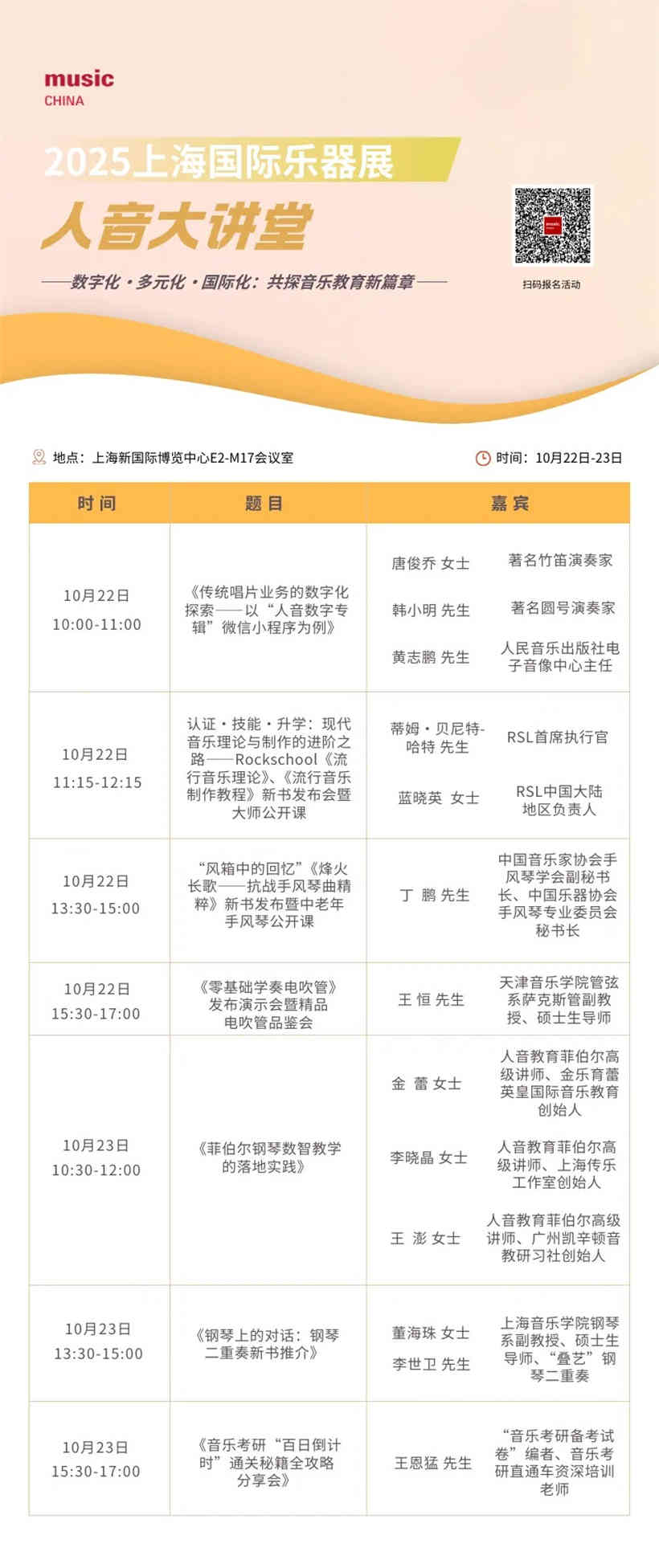 2025年,人音大讲堂将紧扣乐器与音乐教育行业数字化、多元化、国际化的发展趋势,内容涵盖传统乐器教学创新、数字科技融合应用、现代音乐理论与制作、乐器演奏大众普及等多个热点领域。来自音乐院校、出版机构、国际认证体系的专家学者将联袂登场,通过新书发布、专题演讲、公开课等多种形式,分享最具启发性的教学理念与实践成果。嘉宾将围绕“传统唱片业务的数字化路径”“现代音乐认证与升学指导”“抗战手风琴曲的历史演绎与中年教学”“电吹管零基础入门演示”“菲伯尔钢琴数智教学实践”“钢琴二重奏教材推介”“音乐考研百日备考策略”等丰富议题展开深入探讨,带来兼具学术高度与实践价值的内容分享。