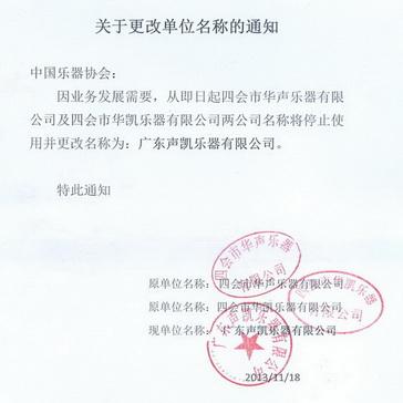 中国乐器协会网讯: 因业务发展需要,从即日(2013年11月18日)起,四会市华声乐器有限公司及四会市华凯乐器有限公司两公司名称将停止使用,并改名称为:广东声凯乐器有限公司。