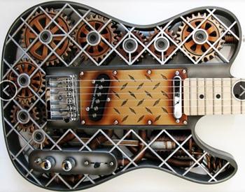 中国乐器协会网讯:从2011年开始,新西兰奥克兰梅西大学的机电一体化设计工程师兼教授Olaf Diegel就利用激光烧结打印技术(SLS)来制作精美复杂的电子乐器,并取名为“怪异吉他”。Diegel给它们加上了桃木或枫木主架、木质琴颈、桥接器、拾音器,这让它们成为了完全可以演奏的乐器。