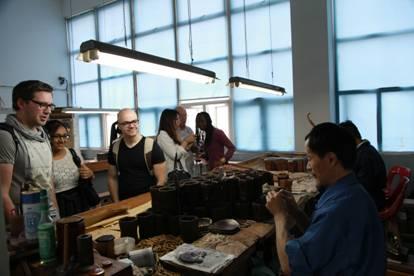在技师工作室中,同学们详细了解了二胡的制作过程并邀请制作师表演经典二胡曲目,大家不由自主地伴着琴声哼唱起来,气氛非常融洽。在车间矗立着的仿敦煌壁画系列巨型葫芦琴面前,同学们主动邀请工作人员为他们合影,来纪念此次中国民族器乐文化之旅。