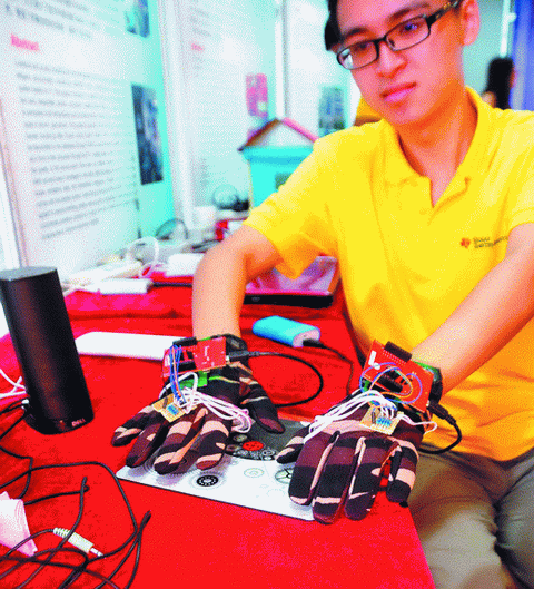 设计学生熊伟伦给记者揭示了其中的奥秘,“我们的设计运用的就是传感器,一段链接到手机APP上,通过终端选择乐器、音量等,在指尖弹奏出各种乐曲。”熊伟伦说,该系统还能同时接入多个手套,和小伙伴们一起‘弹奏’,俨然就是一支乐队。”