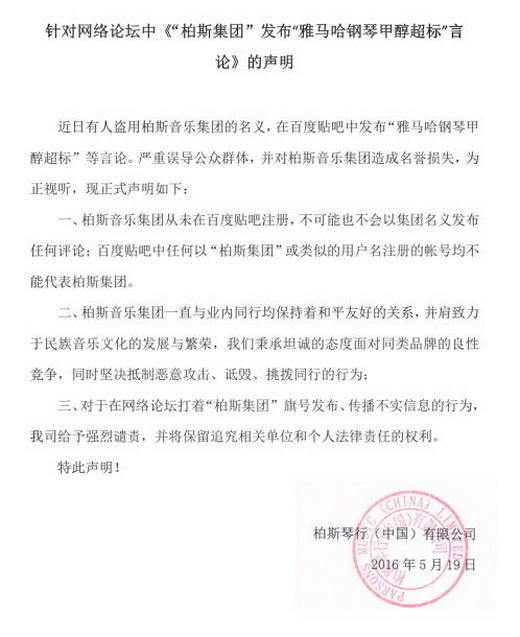 针对网络论坛中《“柏斯集团”发布“雅马哈钢琴甲醇超标”言论》的声明-中国乐器协会