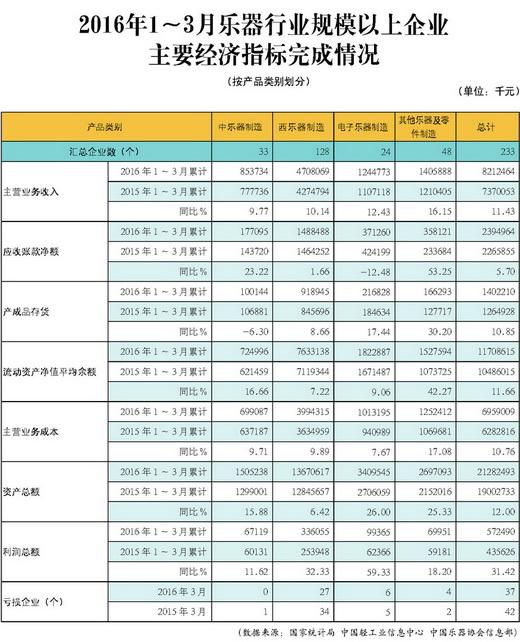 中国乐器协会网讯:据中国轻工业经济运行及预测预警系统显示,2016年1~3月,规模以上乐器企业233家,比上一年同期增加7家,各项经济指标均呈增长态势,开年形势喜人。累计完成主营业务收入82.12亿元,同比增长11.43%;工业增加值增速为8.5%,高于同期全轻工行业平均水平(6.4%);主营业务收入利润率为6.97%, 高于同期全轻工行业6.3%的平均水平;累计利润总额5.72亿元,同比增长31.42%;乐器行业亏损面为15.88%,低于2015年的17.25%。