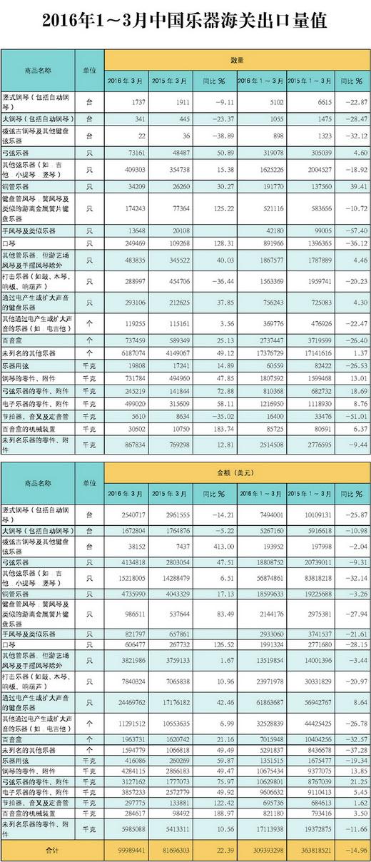 1~3月中国乐器出口个类别中,钢琴出口7055架,同比下降25.05%,出口额1295.51万美元,同比下降20.15%;打击乐器2397.19万美元,同比下降20.97%;电子乐器累计出口额4.84亿美元,同比下降4.70%;弦乐器7568.36万美元,同比下降27.62%。