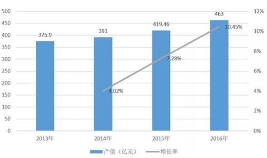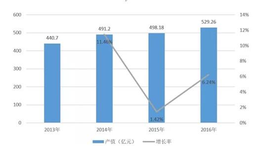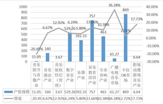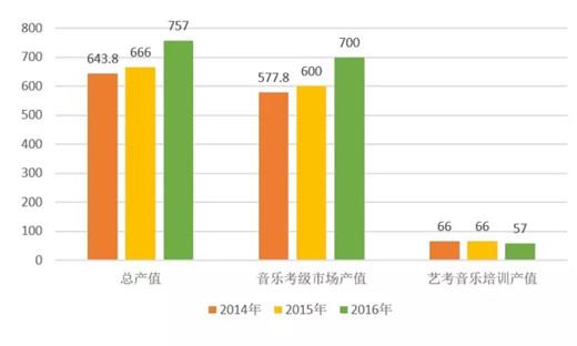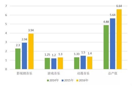 音乐图书与音像出版产业 2016年中国音乐图书与音像产业的总体产业规模达到11.05亿元。其中,音像类出版产业规模为8.38亿元,同比略有下降;“互联网+”大数据平台的应用、O2O模式的不断创新、“黑胶唱片”的复兴,成为音乐图书与音像出版产业发展新亮点。 2013-2016年中国音乐图书与音像产业总体规模对比图(单位:亿元) 音乐演出产业 2016年音乐类演出市场快速增长,总体规模达到了160亿元。同比增长6.7%。票房总收入约为48.13亿元,其中剧院音乐类演出票房收入约12.27亿元,演唱会的票房收入约30.21亿元,音乐节票房收入约4.83亿元,livehouse票房总收入8285万元。演出场次、观演人次、上座率均全面回升。演出行业的市场化、产业化、国际化水平进一步提升。 2012-2016年中国音乐类演出市场票房对比图(单位:亿元) 音乐版权经纪与管理 2016年中国音乐著作权协会许可收入达到1.84 亿元人民币,同比增长8.2%。中国音像著作权集体管理协会的总收入达到1.83亿元人民币,同比增长18.06%,呈现快速增长的发展态势。全国政协会议上首次提出《音乐产业促进法》提案、国家版权局出台相关政策法规规范版权管理、引导数字音乐独家版权相互授权等举措,都为音乐产业的版权保护营造了良好的整体环境。 2014年—2016年音乐版权各项权利收入对比图(单位:万元) 数字音乐 2016年,中国数字音乐的产业规模达到529.26亿,同比增长6.2%。其中PC端与移动端的总产值达到143.26亿元,同比增长39.36%,主要动能来自快速增长的付费用户群体。电信音乐增值业务产值约386.66亿元,同比降低3%,但新增4G音乐的多媒体流量业务、数字音乐平台的多元化盈利模式成为年度亮点。 2012年--2016年中国数字音乐产业市场规模对比图及增长率 乐器 2016年中国乐器行业完成主营业务收入392.33亿元,同比增长7.56%;累计利润总额28.93亿元,同比增长10.67%;累计完成出口交货值116.45亿元,同比下降5.17%。乐器出口继续有微量下滑,但主营业务收入和利润稳步增长,表明产业结构调整发挥了有效作用。 2014—2016年乐器行业主要经济技术指标(单位:亿元) 音乐教育培训 2016年音乐教育培训总产值为757亿元,同比增长13.6%。其中,音乐类艺考报名人数约为11.4万人,艺考音乐培训产值57亿元,同比略有下降;音乐考级报名人数达135万人,社会音乐考级培训总值约为700亿元,同比增长16.6%。新媒体技术的广泛应用,金融资本的持续注入带动音乐教育培训市场的新一轮行业洗牌,综合化、多元化的大型连锁经营培训机构成为新趋势。 2014—2016年音乐教育培训产业产值对比(单位:亿元) 专业音响 2016年我国音响产品总产值约为2908.48亿元,同比增长3.57%。受益于音乐产业的快速发展,其中与音乐制作、传播、欣赏环节密切相关的专业音响设备总产值约为463亿元,同比增长10.45%。呈现出高速增长的态势。 2013年—2016年中国专业音响产值规模对比图 广播电视音乐 2016年音乐广播广告费约为15.27亿元,同比增长2.1%;2016年音乐类电视综艺节目及视频网站自制音乐类综艺节目持续活跃,数量和类型稳中有增,电视音乐类综艺节目广告总收入超过46亿元,同比增长53.4%。市场潜力巨大,但产业化发展机制尚需完善。 2013—2016年广播电视广告收入对比(单位:亿元) 卡拉OK 2016年卡拉OK行业总营收达869亿元,同比增长2.7%。在传统实体KTV持续萎缩、有待转型和商业模式创新的同时,在线K歌结合综艺选秀、VR/AR直播等形式进入泛娱乐时代,与此同时,线下迷你KTV的兴起,也吸引了大量资本的涌入,带来行业资产价值的重估。 2013-2016卡拉OK行业总产值对比图(单位:亿元) 影视剧、游戏、动漫音乐 2016年,我国影视剧、游戏、动漫音乐的总产值约6.64亿元,同比增长17,7%。其中游戏音乐收入在约1.3亿元,动漫音乐收入约1.4亿元,影视剧音乐产业总值约为3.94亿元,同比增长34%。VR、AR等新科技给游戏、动漫产业注入新的活力,而影游联动、游娱联动和动娱联动创新模式的不断涌现,也给产业联动发展带来了广阔空间。 2014年--2016年影视剧、游戏、动漫音乐产值对比图(单位:亿元)