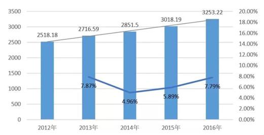 根据子报告将2016年相关细分行业的市场规模数据梳理总结如下: 中国音乐产业细分行业的市场规模估算 2016年中国音乐产业总规模约为3253.22亿元,比较2015年增长了7.79%,同比增速高于同期GDP增速1.09%。数据表明以数字音乐产业为代表的新动能成为推动中国音乐产业整体快速增长的主要动力。同时,在政策扶持和资本青睐下,传统音乐产业与新兴音乐产业加快融合,不断重构产业链条、创新商业模式、激发消费活力,推动中国音乐产业在经济新常态下正式进入快速增长的“新时代”。 2012年-2016年中国音乐产业年度市场规模对比图(单位:亿元) 产业结构分析