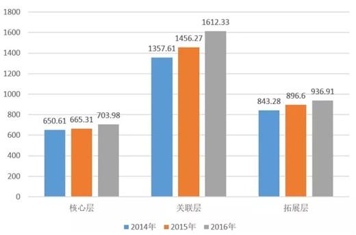 2016年音乐产业各层次比重 2016年,音乐产业核心层产值规模为703.98亿元,所占比重21.64%,同比有所下降,数据表明以音乐创意为主的核心层行业正处于新旧动能转换的关键节点,传统实体音像业进一步下滑,数字音乐产业因人口红利逐步消退、用户增量变缓而逐步进入存量用户的深耕时代;但音乐现场演出的崛起、数字音乐付费用户的快速增长以及商业模式的创新,都将推动核心层产业进入快速增长的轨道。 2014-2016年音乐产业产值规模对比(单位:亿元) 2016年关联层乐产业产值规模达到1612.33亿元,同比增长10.72%,虽然以实体产品制造、销售为主的关联层产业受到宏观经济影响较大,但受益于音乐产业关联制造装备市场的激增以及中国制造进一步向中国创造的转型,关联层中乐器产业、专业音响产业都实现了两位数增长,企业利润同步稳步增长。 2014-2016年音乐产业各层占比情况对比(单位:亿元) 2016年拓展层音乐产业产值规模达到936.91亿元,同比增长4.5%。拓展层中占比较大的卡拉OK行业仍然处于传统娱乐业与互联网时代娱乐业融合发展的十字路口,在线KTV与线下迷你KTV未来市场潜力巨大,预计将未来可实现产业规模的高速增长。 2016年中国音乐产业各细分行业产值与增长对比(单位:亿元) 从中国音乐产业各细分行业的整体产值、增速对比来看,产业规模前三的数字音乐产业、音乐教育培训产业、卡拉OK市场,全部为直接面向C端用户市场的音乐服务业;可见未来产业规模持续做大做强的方向依然是以用户为核心持续供应优质的音乐产品。产业规模增速在两位数以上的的行业占到整个细分行业的50%,显示出中国音乐产业蓬勃的发展动力。 消费市场分析