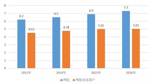 2013-2016年中国网民及网络音乐用户规模对比图(单位:亿人) 从线下消费市场来看,2016年音乐演出市场持续活跃,演出场次、票房总收入、观演人次都创新高,同比实现快速增长。从线上消费市场来看,2016年互联网音乐用户占互联网总用户的68.8%,用户规模达到5.03亿,较之上年同期增长0.1%,增速已经放缓。但付费用户数量迅速上涨,与2012年相比,音乐付费用户数上涨了113%;流媒体音乐付费逐渐成为新趋势。