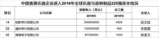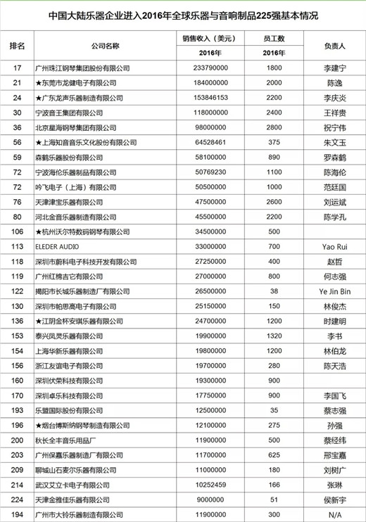 2016年列入225强榜单的中国公司共42家,其中香港3家,中国台湾7家,中国大陆入围公司32家,广州珠江、北京星海、森鹤乐器、宁波海伦、吟飞电子、天津津宝、河北金音、深圳蔚科、广州红棉、泰兴凤灵等中国乐器公司列入榜单。