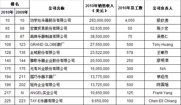 中国台湾乐器企业进入2010年全球乐器与音响制品225强基本情况-中国乐器协会