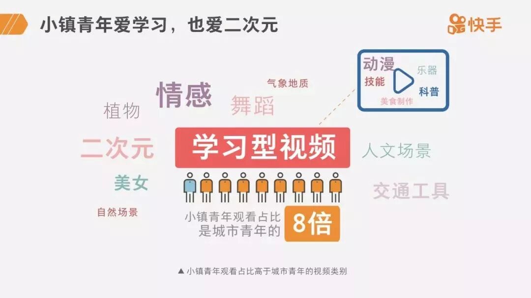 《2019小镇青年报告》显示,由于小镇青年的可支配时间明显多于城市青年,且改变自身命运的愿望强烈,技能、科普、美食、乐器等“学习型视频”的观看占比,小镇青年是城市青年的8倍。虽然三四线城市的物质条件可能不如一二线城市,但小镇青年不甘于现状的态度令他们更愿意主动丰富自身的技能。如今,一二线城市的知识付费多集中于职场、专业知识等领域,小镇青年对美食、养殖、乐器、科普等领域的知识与技能需求,正在创造出新市场。(互联网数据资讯中心)