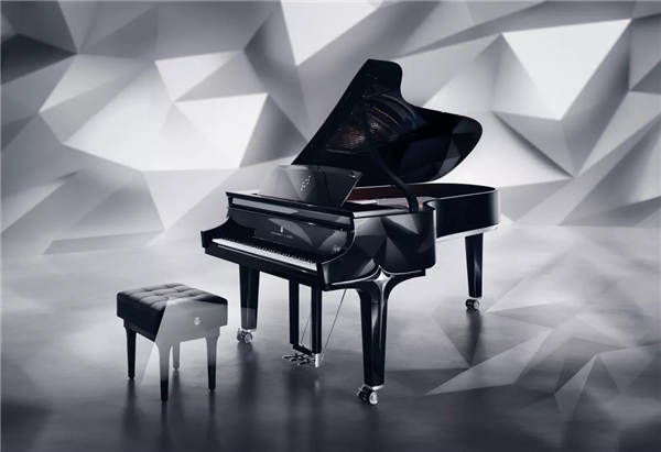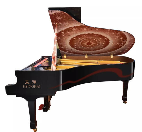 北京星海钢琴集团为了庆祝建国70周年、建厂70周年,邀请了工艺美术大师闫庆设计一款70周年纪念版钢琴,以人民大会堂的万人大礼堂穹顶为主创元素,辅以蛋壳镶嵌工艺,撒金粉贴金工艺、大漆工艺(传统漆器工艺),整体设计构图稳重大气、装饰性强。运用重复、渐变、概括、呼应等艺术表现手法,形成强烈的视觉冲击力,使人印象深刻。