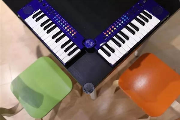 "七耳兔行走乐队琴"是一款可以折叠的便携式电子琴。两块键盘折叠为竖向两块键盘可背在胸前演奏,180角度任意折叠可以方便两人共享一台琴演奏,38个音色直选按钮可播报乐器名称,方便孩子记住乐器音色;两块键盘可以设为不同音色,实现一个人的“二重奏”。