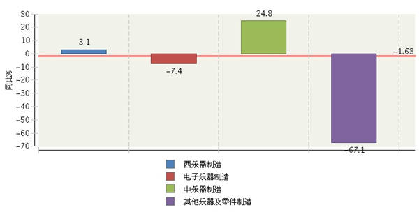 从子行业分布来看,电子乐器大幅下降,累计产成品1.98亿元(占12.61%),同比下降16.32%;2017年,西乐器制造累计完成产成品10.06亿元(占64.09%),同比下降5.07%;中乐器制造累计完成产成品1.82亿元(占11.58%),同比增长2.35%;其他乐器及零件制造累计完成产成品1.84亿元(占11.72%),同比增长3.54%。