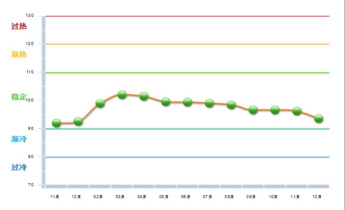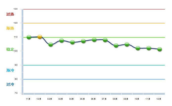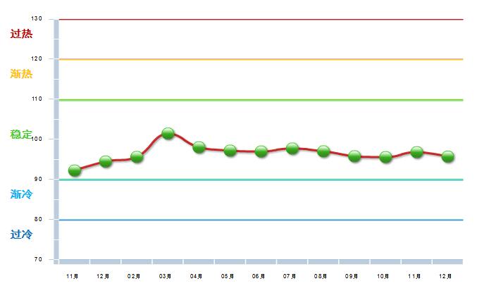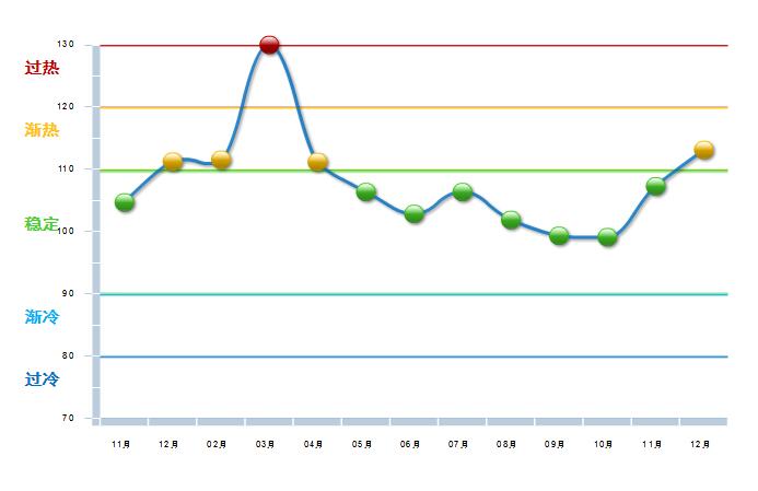 从分指标看,主营业务收入指数(93.53)和资产指数(101.34)一直在稳定区域内波动;出口指数(113.15)四月出现过热现象,全年高位震荡,最终停留在渐热区域;利润指数(92.86)年初偏冷,一路震荡上行,最终停留在稳定区域。