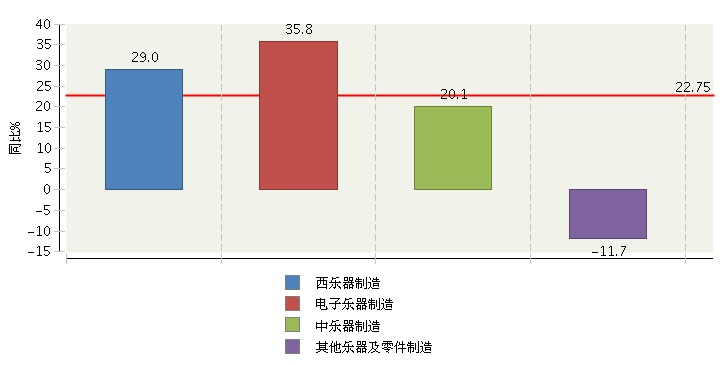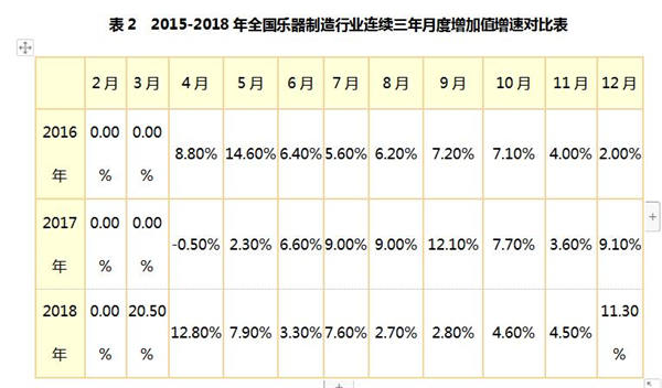 2018年1-12月,全国乐器行业累计工业增加值增速为7.10%,高于同期全轻工行业5.81%的平均水平。