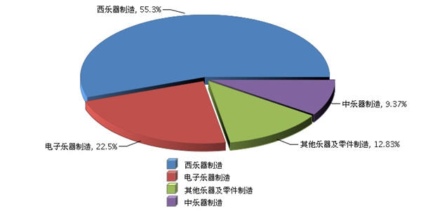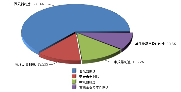 2018年,乐器行业各子行业均保持增长态势,其中,西乐器占比过半,累计完成主营业务收入214.06亿元(占55.3%),同比增长3.80%;中乐器53.23亿元(占9.37%),同比增长4.80%;电子乐器78.96亿元(占22.5%),同比增长5.34%;其他乐器及零件制造45.19亿元(占12.83%),同比增长5.17%。