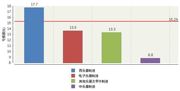 2018年亏损面有所回升,全国乐器行业累计亏损面为15.29%,同比增长4.55%。,高于同期全轻工行业亏损面平均水平(13.78%)。从子行业看,西乐器亏损面高于乐器行业平均水平,为17.73%; 中乐器亏损面最低,为8.82%。