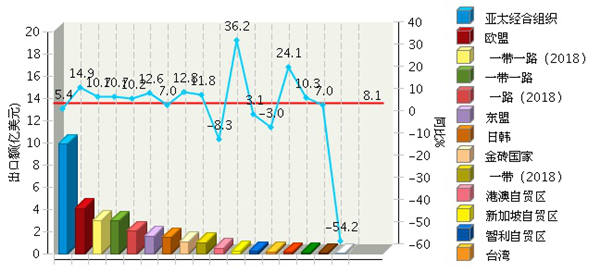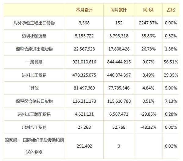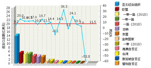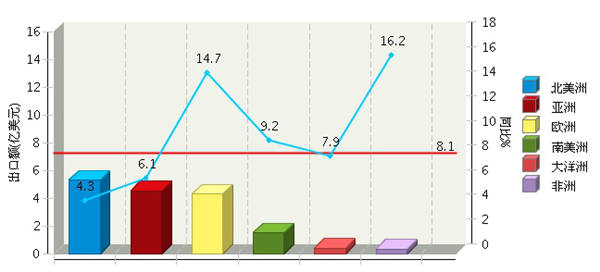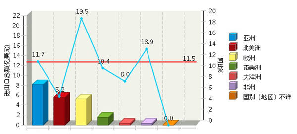 从各大洲贸易分析,亚洲占比居首位,累计进出口总额8.11亿美元(占38.3%),同比增长11.66%;主要经济组织贸易中,一带一路国家进出口总额微增,累计进出口总额4.5亿美元(占21.27%),同比增长16.41%,欧盟完成累计5.04亿美元(占23.81%),同比增长19.96%,增长较快。