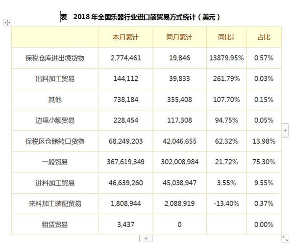 我国乐器进口贸易方式中,一般贸易方式超过四分之三,累计完成进口额3.68亿美元(占75.3%),同比增长21.72%;保税区仓储转口货物完成累计进口额0.68亿美元(占13.98%),同比增长62.32%;来料加工装配贸易完成累计进口额0.02亿美元(占0.37%),同比下降13.4%;2018年没有租赁贸易进口额。