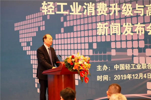 为全面贯彻党的十九届四中全会精神,推动轻工业高质量发展,12月4日,由中国轻工业联合会主办的“轻工业消费升级与高质量发展”新闻发布会在北京人民大会堂举行。中国轻工业联合会会长张崇和,工业和信息化部消费品工业司司长高延敏,国家发展与改革委产业发展司司长卢卫生,国家市场监管总局产品质量安全监督管理司副司长孙会川出席发布会并讲话。中国轻工业联合会党委副书记王世成主持发布会。
