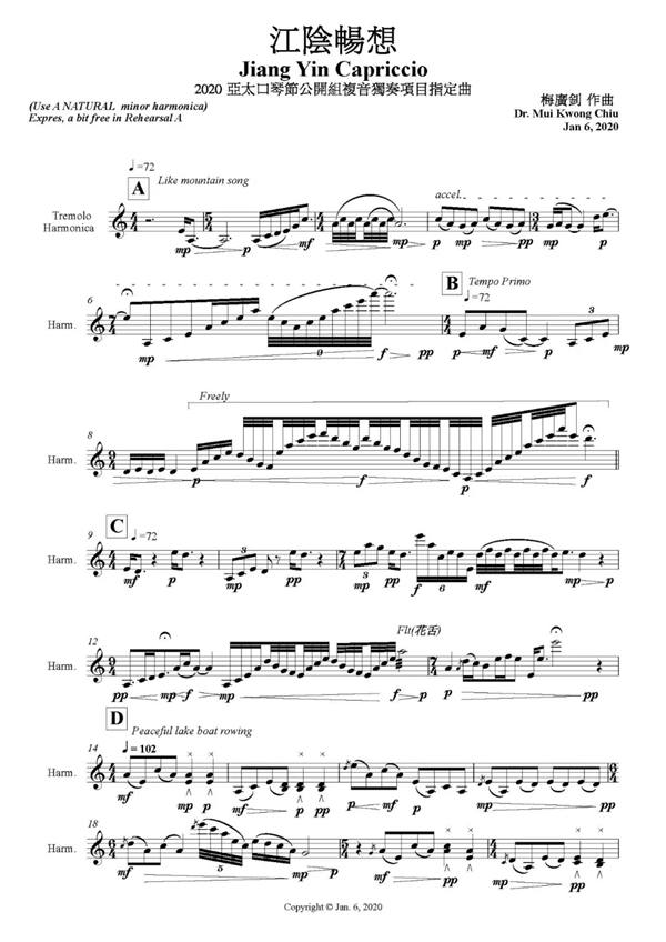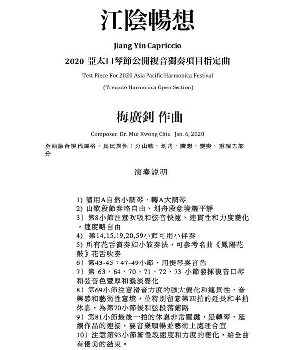 大家新年好,2020年是一个特殊的春节,由于新型冠状病毒肺炎在全国蔓延,形势严峻,为做好防疫工作,全国人民无法出门,更无法出游,经13届亚太口琴节组委会商议,现正式公布13届亚太口琴节公开组半音阶口琴指定曲和复音口琴指定曲,全国琴友可在这段时间加紧练习,磨炼琴技,同时也要做好防疫措施。