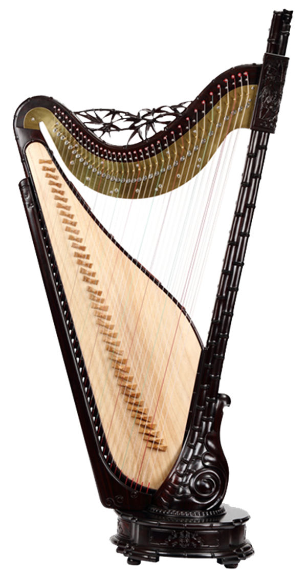 五福竹音箜篌,通身采用大叶紫檀料,琴体雕以竹叶及五蝠(福),是一整块原料镂空雕花而成,并非拼接,雕刻雕工耗时近一年的时间,寓意满满。面板为泡桐材料,音色比常规用的榆木面板更为通透。