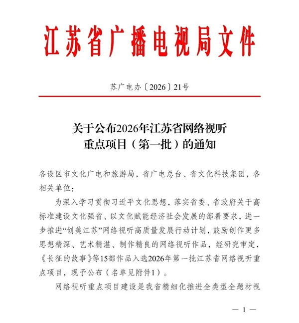 近日,江苏省广播电视局公布了2026年第一批江苏省网络视听重点项目名单,其中,由上海国光口琴厂有限公司投资出品、江苏智果互动文化传播有限公司拍摄制作的爱国主义教育电影(网络微短剧)《追光》成功上榜。