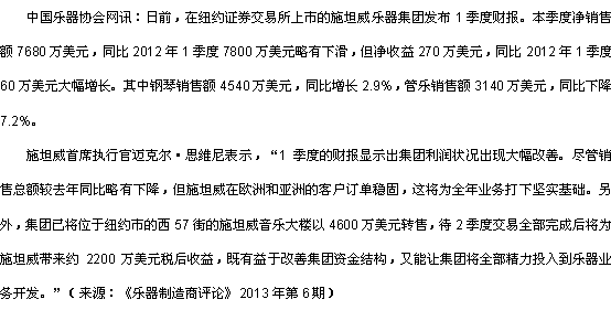 施坦威乐器集团发布2013年1季度销售业绩-中国乐器协会