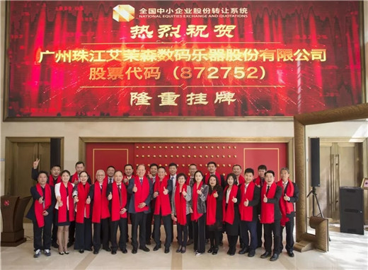 2018年4月25日上午,广州珠江艾茉森数码乐器股份有限公司在首都北京金阳大厦全国中小企业股份转让系统中心隆重举行新三板挂牌敲钟仪式。中国轻工业联合会党委副书记、中国乐器协会理事长王世成,广州市国资委副巡视员宋衡,中国乐器协会常务副理事长曾泽民,珠江钢琴集团党委书记兼董事长、艾茉森公司董事长李建宁,艾茉森公司总经理刘春清及证券代表、媒体代表、股东代表、客户代表、员工代表等嘉宾共同出席了挂牌仪式,共同见证美好时刻。