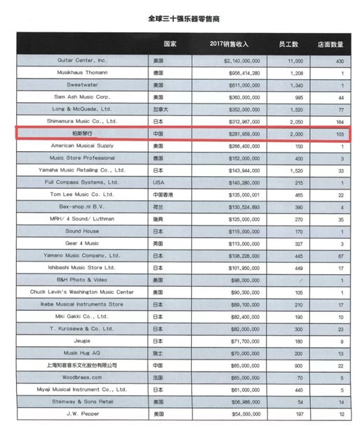 美国《Music Trades》杂志2018年5月刊权威发布 2017“全球三十强乐器零售商” 最新榜单