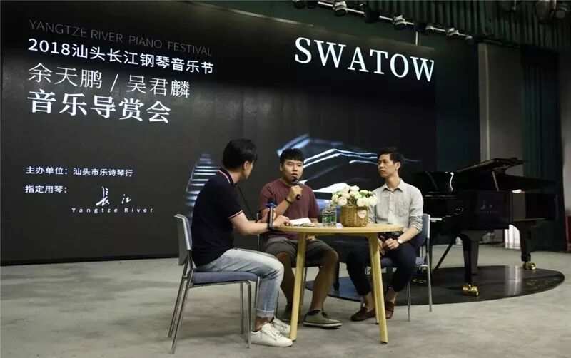 在8月13日,2018汕头长江钢琴音乐节·余天鹏、吴君麟独奏音乐会华丽上演。为了帮助听众更好地理解当晚的曲目结构和音乐背景,活动方在当天下午特地举办了余天鹏、吴君麟音乐导赏会。旅英青年钢琴家余天鹏与钢琴英才吴君麟面对现场近四百名听众,侃侃而谈,细致的讲解和生动的示范让现场听众对当晚的音乐会有了更深刻的了解。当晚,余天鹏与吴君麟带来了与导赏会一脉相承的钢琴独奏音乐会,优雅如天籁般的曲目接连响起,令现场的音乐爱好者们沉醉不已。