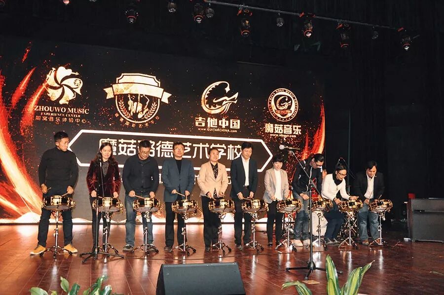与会嘉宾致欢迎辞后,所有领导与嘉宾联合击鼓——美国DW限量版24K限量版大师签名款军鼓!正式启动三大战略项目!开启了2019吉他中国与周窝音乐小镇的合作新篇章。最后由来参加培训的魔菇全国各地分部老师魔菇新乐队 、老乐队以及吴琳、汶麟、张军、鼓手大梁以及有爵士鼓大师古贺泉与乌克兰乐队即兴表演,为整个活动划上圆满句号。