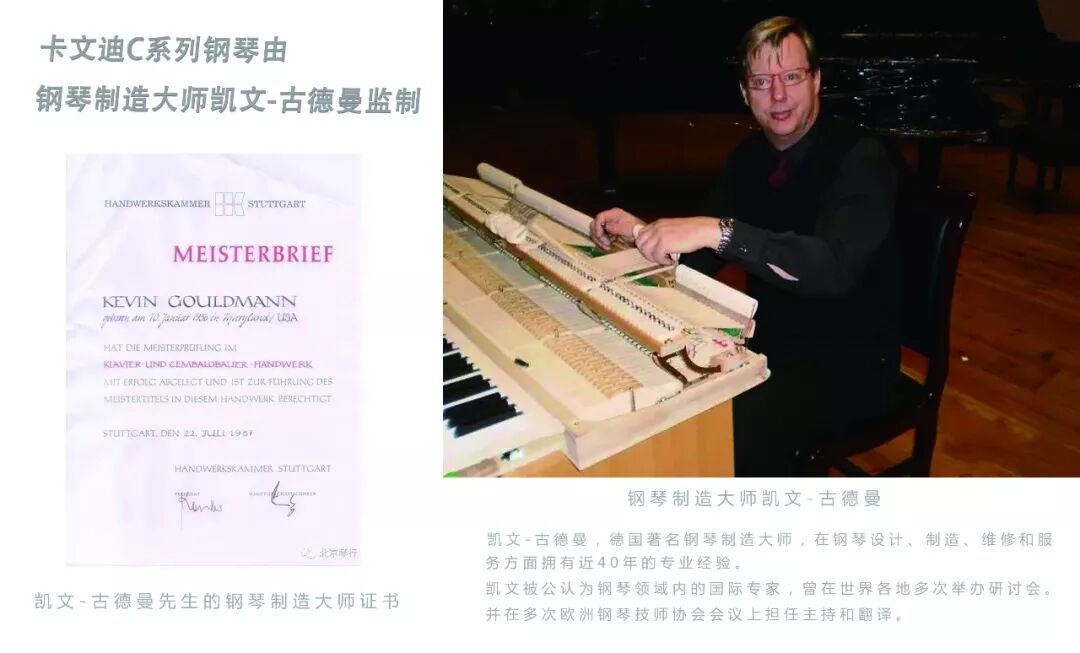 英国卡文迪C系列钢琴由欧洲钢琴制造大师凯文-古德曼助力打造。凯文-古德曼,世界著名钢琴制造大师,在钢琴设计、制造、维修和服务方面拥有近40年的专业经验。凯文被公认为钢琴领域内的国际专家,曾在世界各地多次举办研讨会。他连续12年担任丹麦钢琴制造师协会委员会委员,曾担任欧洲钢琴技师协会和国际钢琴制造和技师协会代表,并在多次欧洲钢琴技师协会会议上担任主持和翻译。