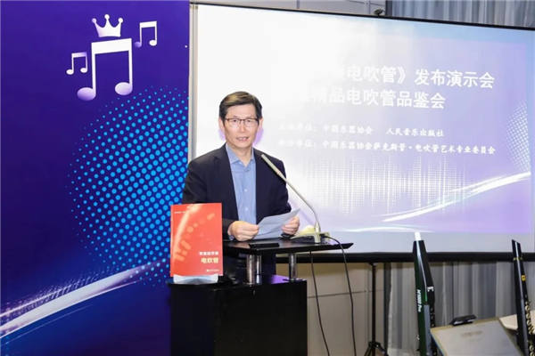 陈晋武在致辞中表示,为更好地适应市场发展和社会艺术教育的需求,结合当前音乐文化市场对电吹管演艺、培训和教学的需求,中国乐器协会联合人民音乐出版社,共同策划出版了这套《零基础学奏电吹管》。这一套专用教材的出版发行,可以有效地打通乐器、出版与教育链条,促进广大电吹管爱好者演奏、教学水平的提高及推动电吹管市场的健康有序发展。