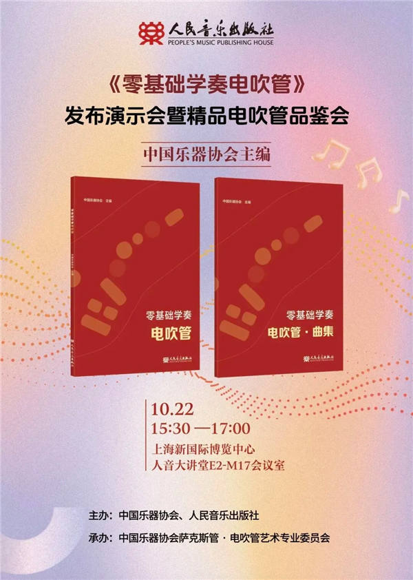 10月22日,由中国乐器协会主编、人民音乐出版社出版的《零基础学奏电吹管》一书在上海乐器展期间正式发布。中国乐器协会第八届专职副理事长陈晋武,人民音乐出版社执行董事(社长)、党委书记、总编辑杜永寿共同为新书揭幕。
