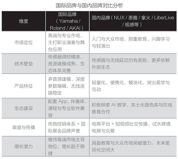 总体来看,智能乐器虽仍处于小众阶段,但已具备“亿元级体量、快于行业整体增速”的特征。其增长逻辑主要体现为:通过 AI教学、静音练习和在线课程降低学习门槛,推动教育普及;无线连接、多音色和互动功能拓展演出与娱乐边界;电商与跨境渠道加速产品触达,推动海外市场突破。在乐器产业整体增量有限背景下,智能乐器正在成为中国乐器产业结构升级与数字化转型的重要突破口。