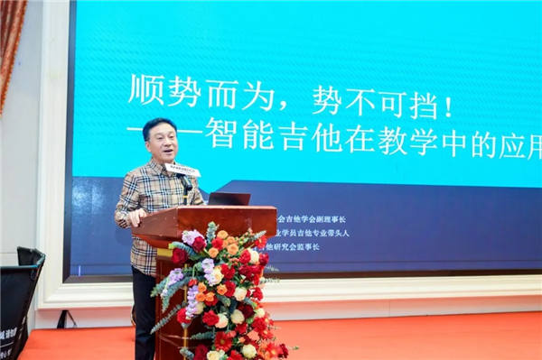 在主旨演讲环节,三位行业专家从不同维度分享了深度洞察。上海市吉他艺术协会会长高艺以《手工原声吉他的艺术价值》为题,阐述了手工琴作为高端市场价值标杆的意义,并探讨了手工琴与工厂琴之间共生共荣的产业关系。原中国音协吉他学会副理事长、广东吉他研究会监事长黑杭林在《吉他艺术的“顺势而为”》中,重点分析了智能吉他在教学场景中的应用价值,指出其能有效满足从中老年、儿童兴趣启蒙,到专业演奏者舞台表现等多层次需求。中国音协吉他学会副秘书长、广东吉他研究会副会长吴连群则以《AI时代下的智能吉他新趋势》为题,从传统痛点、核心价值等维度,阐释了智能吉他如何重塑用户体验。