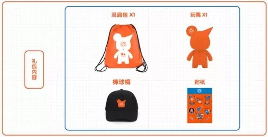 W.KONG玩偶一个,棒球帽一顶,形象贴纸一张,双肩背包一个。