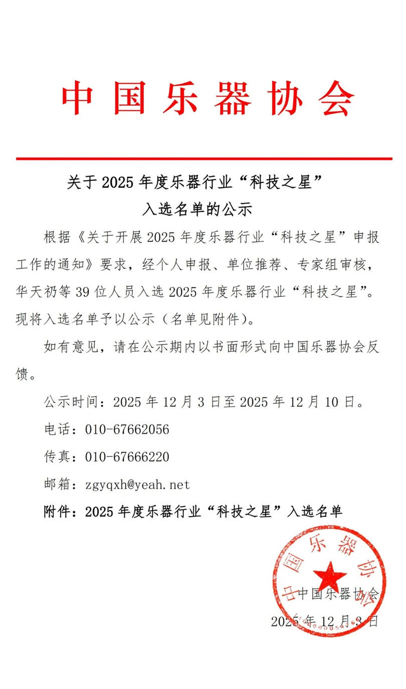 关于2025年度乐器行业“科技之星”入选名单的公示-中国乐器协会