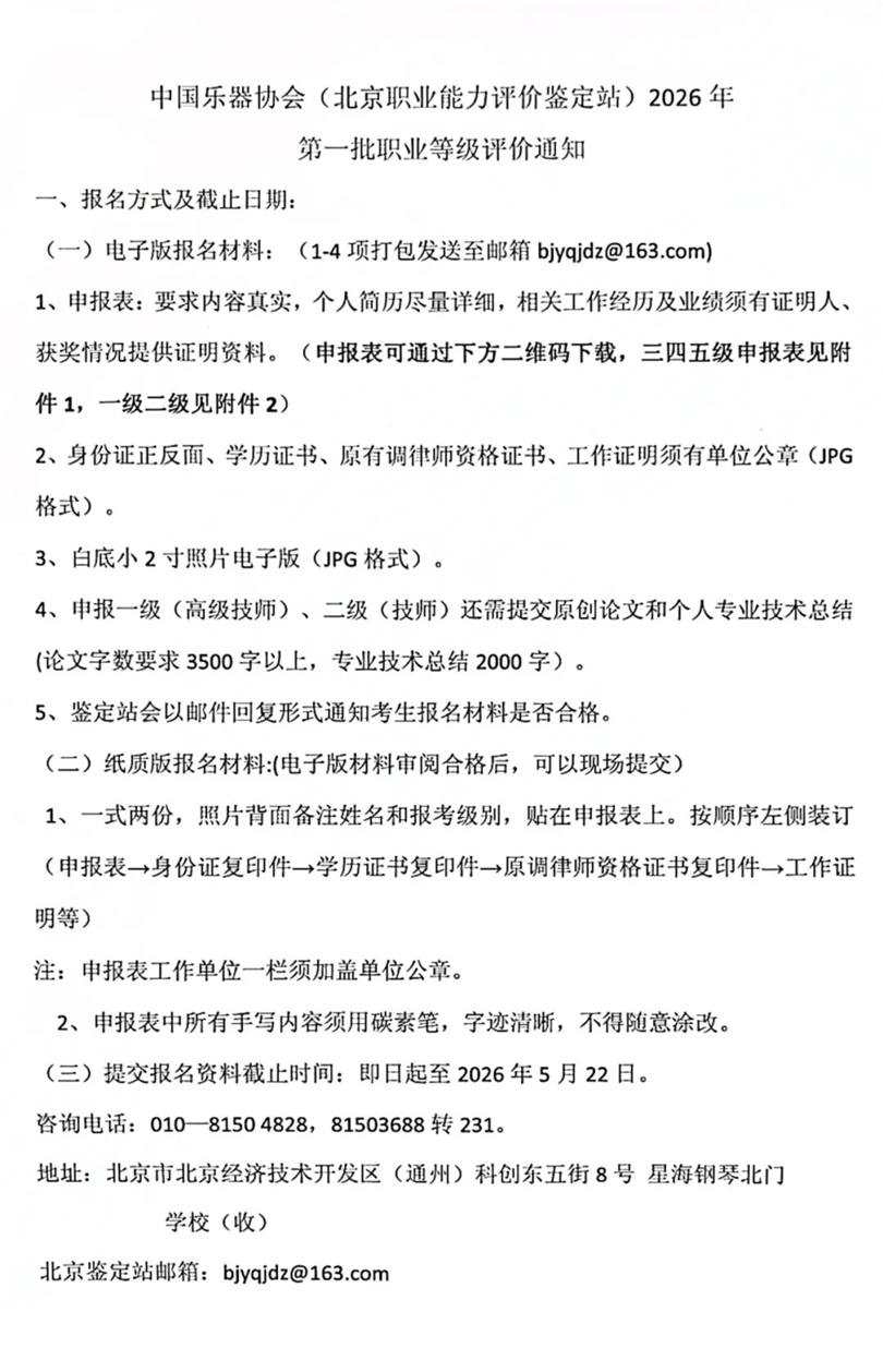 当前位置:首页>公告>中国乐器协会(北京职业能力评价鉴定站) 2026年第一批职业等级评价通知