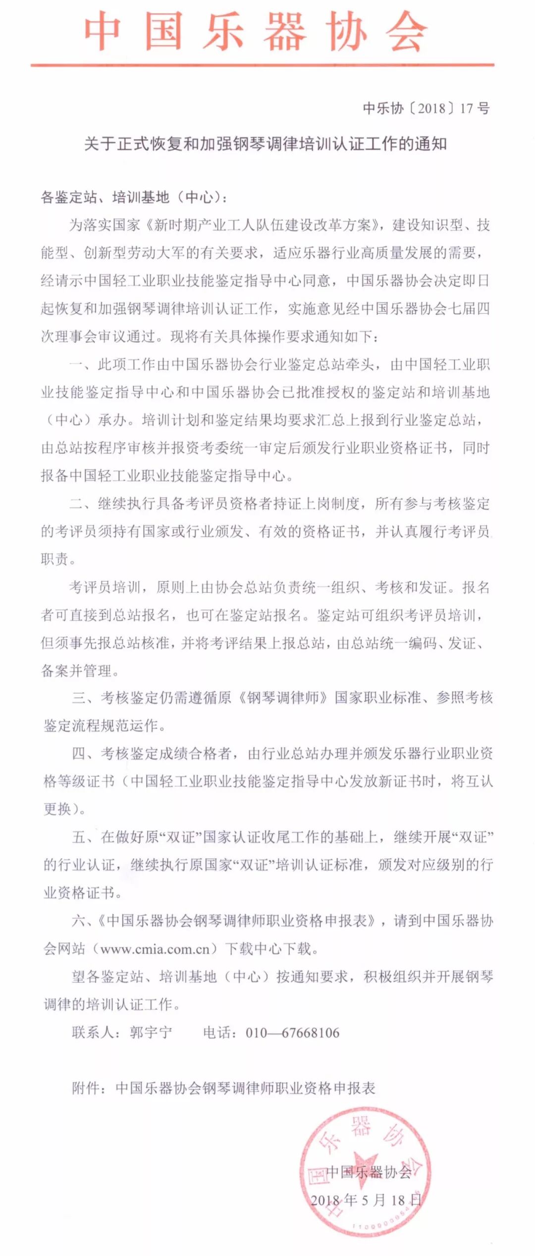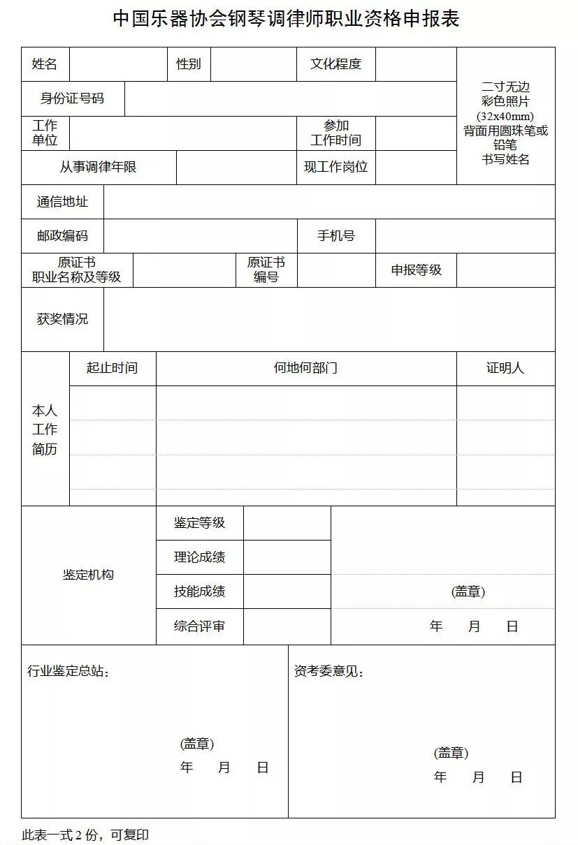 6、将《钢琴调律师资格申请表》和相关材料(一式2份),快递至所要考试的鉴定站(申请一、二级,需提供专业技术总结及相关论文各两份)。鉴定站负责三、四、五级的资格审核和一、二级人员资格的初审。