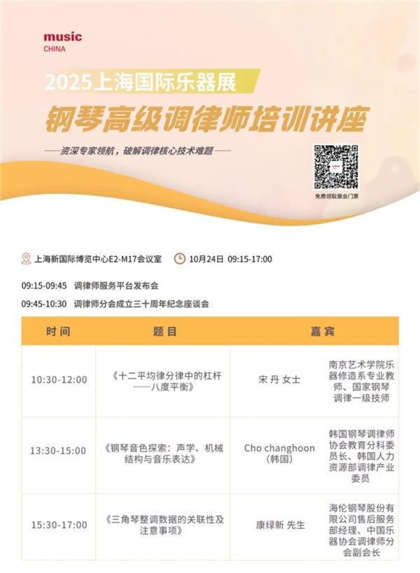 为进一步推动行业技术交流与人才培育,2025上海国际乐器展特邀国内外资深专家,从多维度解析钢琴调律的精髓。内容涵盖十二平均律分律与八度平衡的核心原理,深入探讨音色与声学结构、音乐表现之间的艺术关联,并基于一线实战与管理视角,系统讲解调律应用中的典型问题与解决方案。通过系统讲解、实操演示与现场互动,助力调律师突破技术瓶颈、提升综合素养。